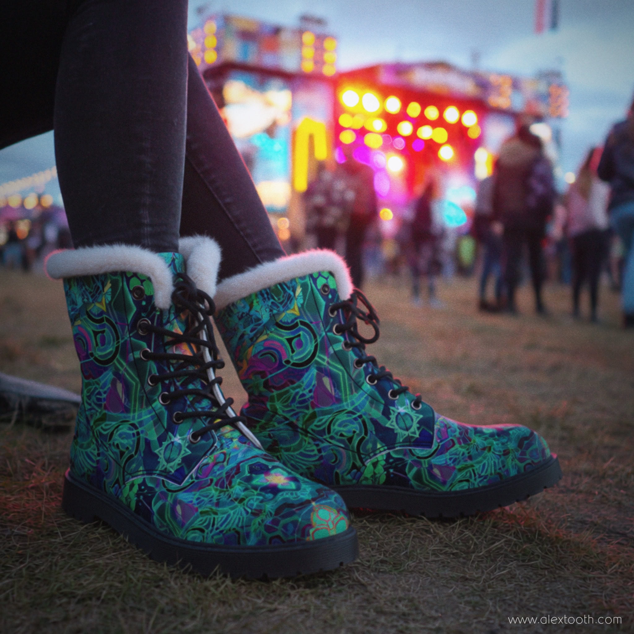 Lined with soft faux fur and finished with a durable vegan leather outer, Dawnwalker Boots are built for warmth, stability, and longevity — without compromising ethics or comfort. The artwork wraps the boots in vivid, visionary patterning, turning a functional staple into a piece of wearable art.