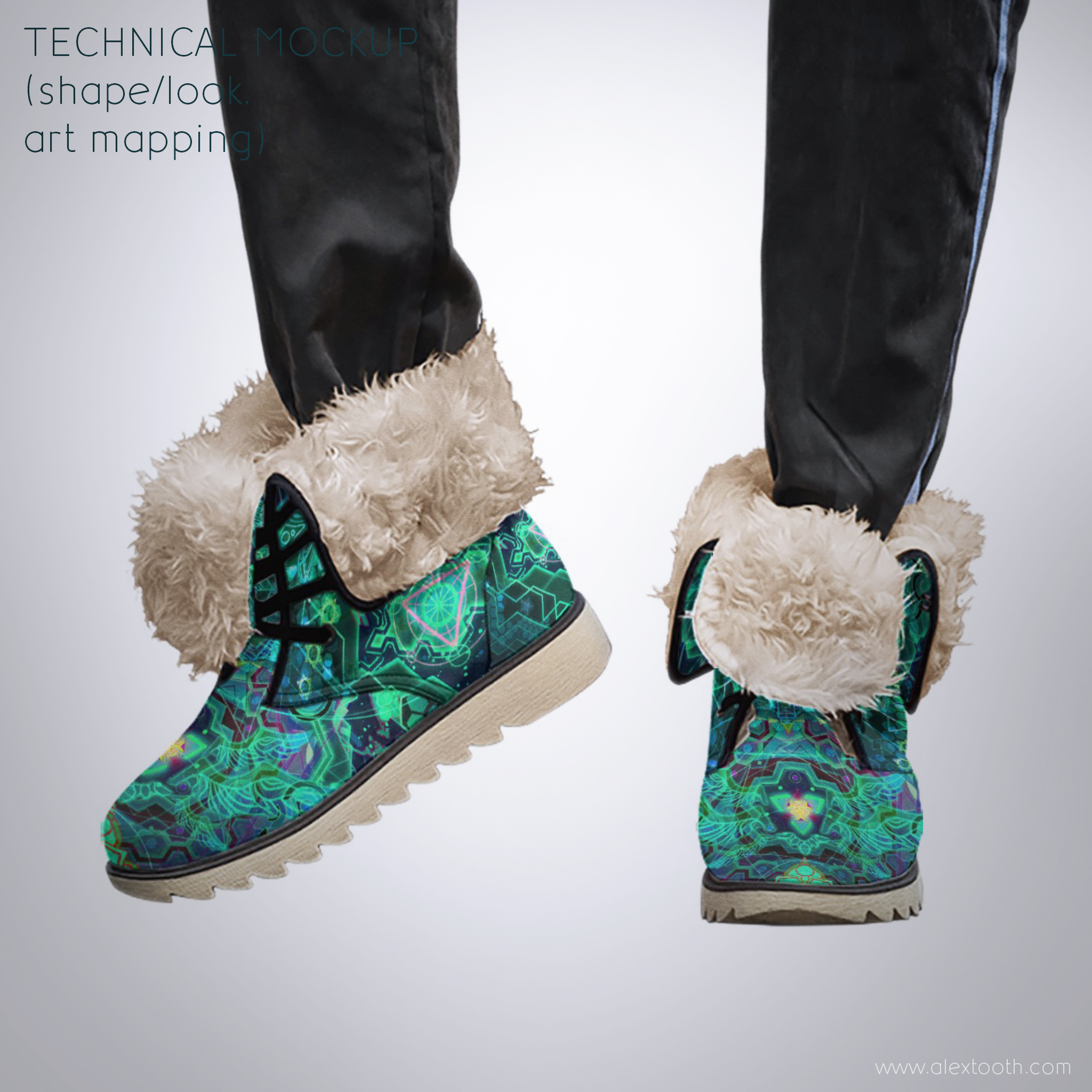 Built as a winter-ready companion, Driftwalker Boots combine sturdy construction with a snug, fleecy interior. They’re made to feel grounded and protective without losing the expressive, visionary edge that defines Alex Tooth wearable art. These boots are practical enough for daily winter wear, yet bold enough to stand out in snow, rain, neon-lit nights, and unfamiliar terrain.