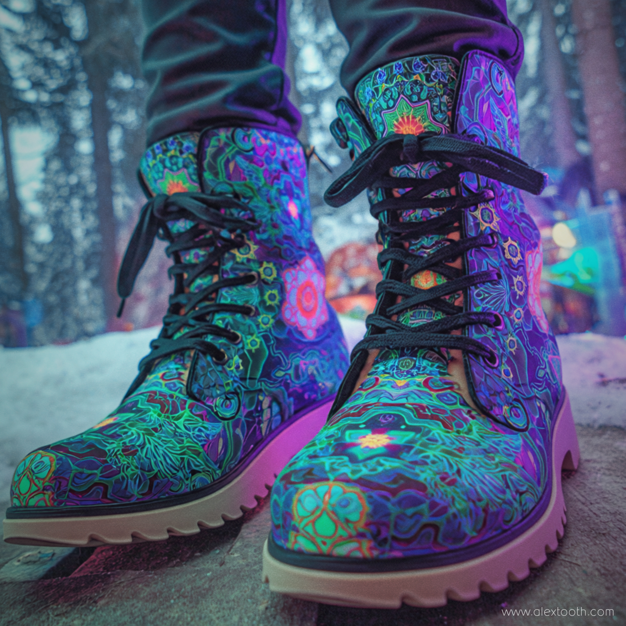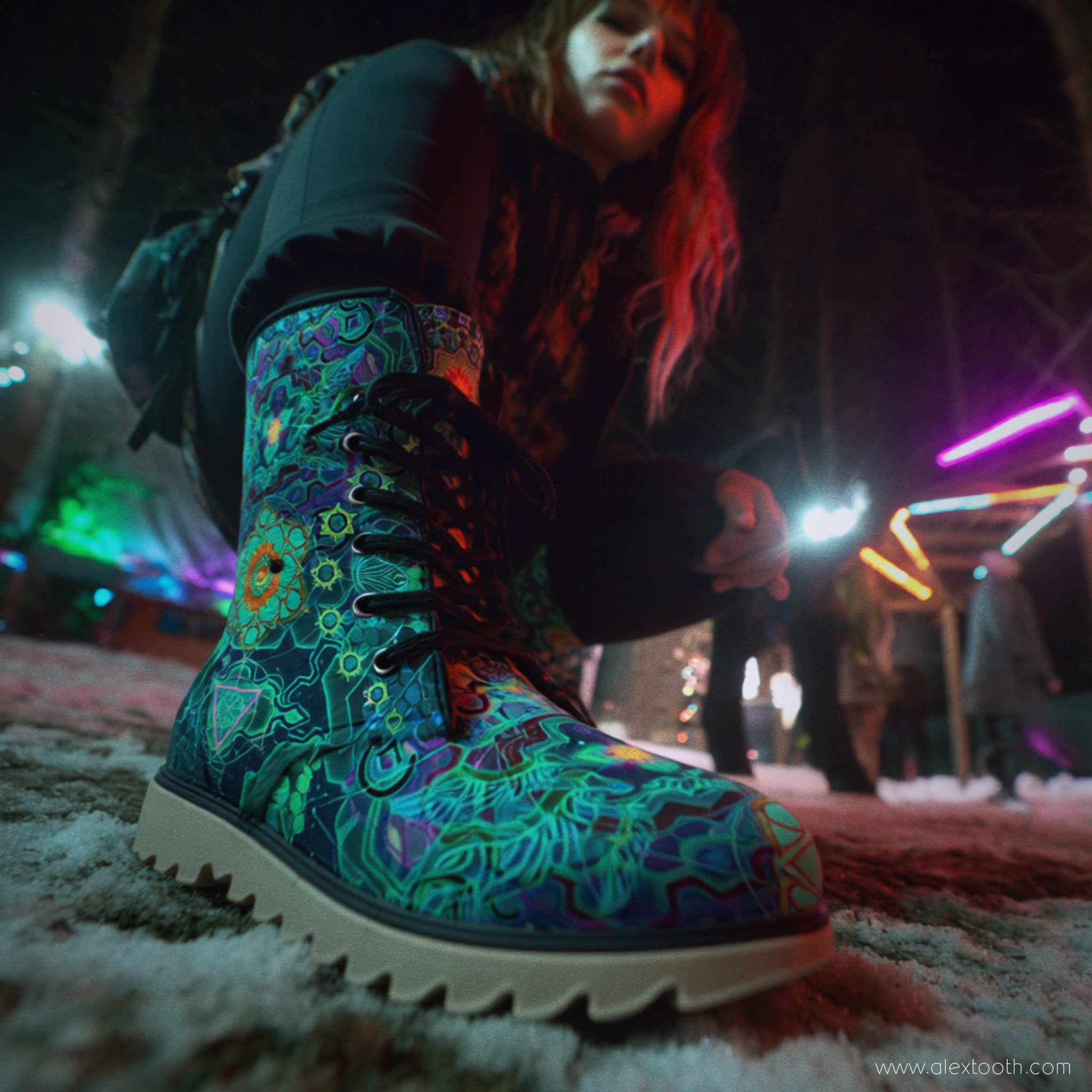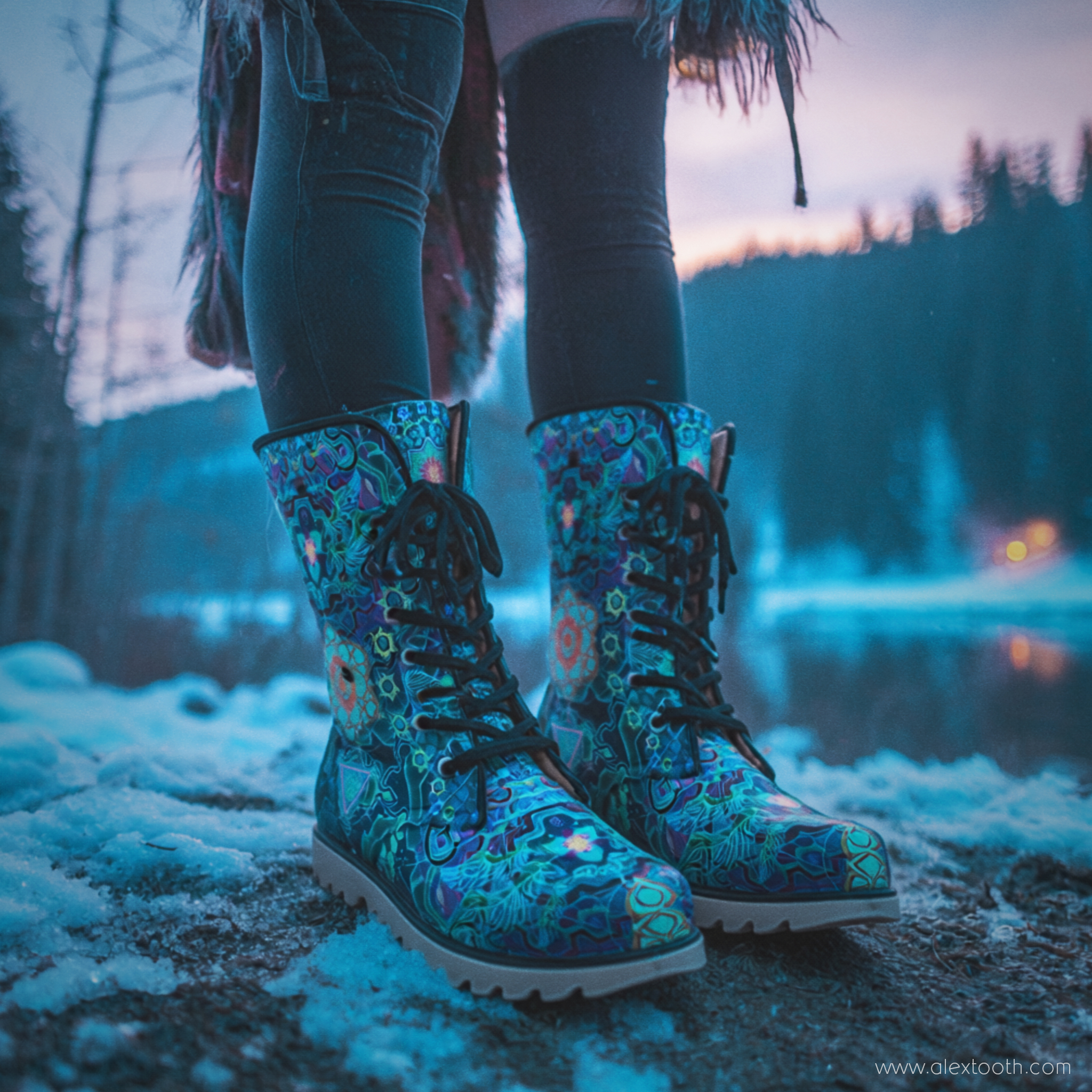 Built as a winter-ready companion, Driftwalker Boots combine sturdy construction with a snug, fleecy interior. They’re made to feel grounded and protective without losing the expressive, visionary edge that defines Alex Tooth wearable art. These boots are practical enough for daily winter wear, yet bold enough to stand out in snow, rain, neon-lit nights, and unfamiliar terrain.