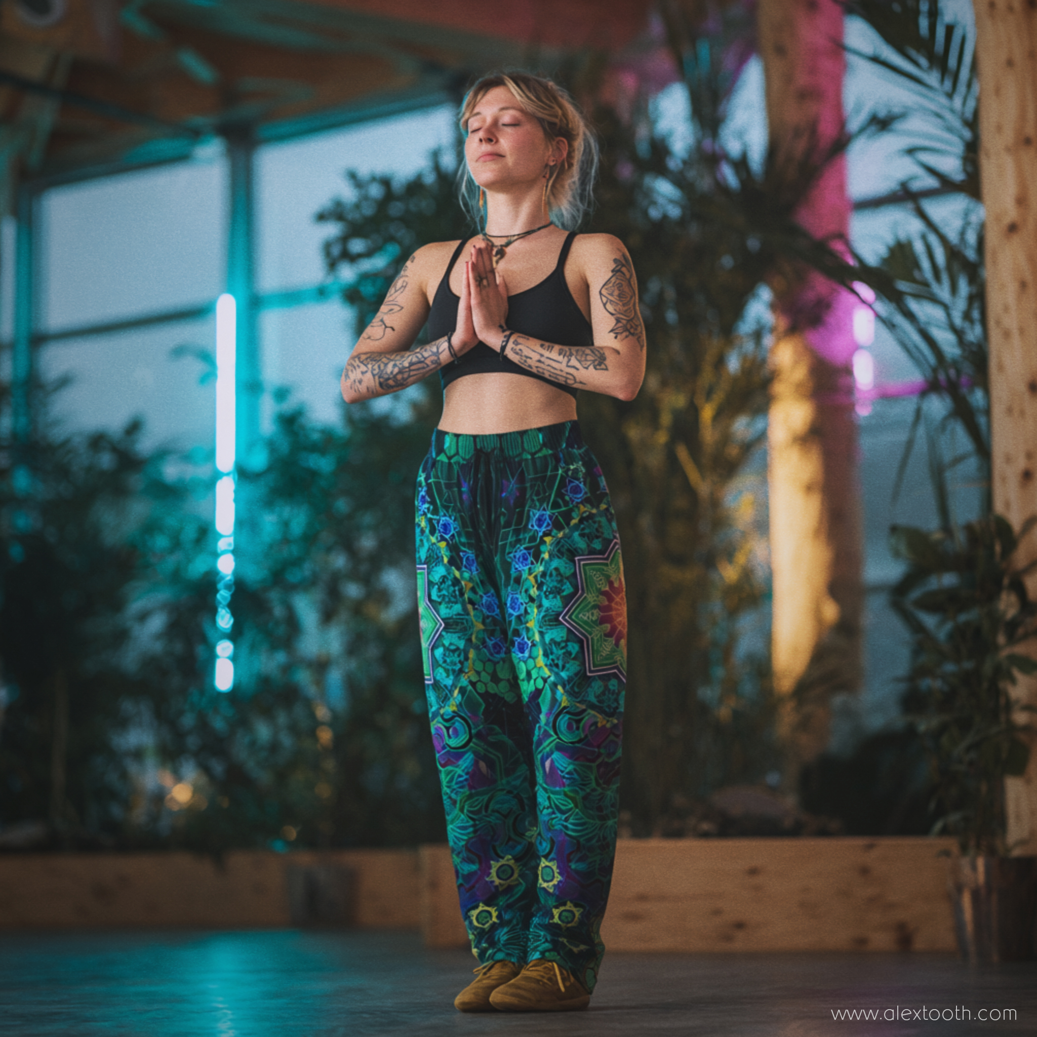 Emerald StarGate leans Festival Clothing deeper into structure. The geometry here feels more layered, more deliberate — something that builds inward as much as it expands outward. Drawing from sacred geometry and ancient geometry, the design forms a kind of visual pathway, something that suggests movement through rather than just across.
