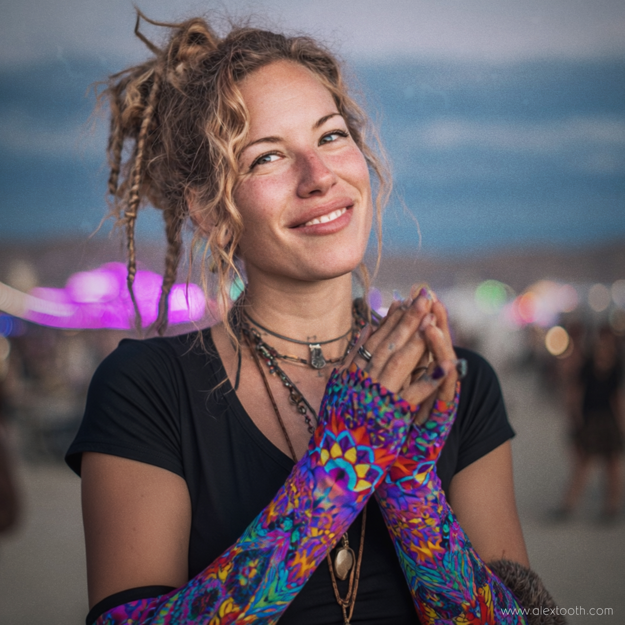 Cut long through the forearm with a fingerless glove design, AuraSleeves offer warmth, sun protection, and freedom of movement. They can be worn as arm warmers, gloves, or lightweight sleeves depending on context — functional enough for daily use, expressive enough for festivals, performance, and night spaces.