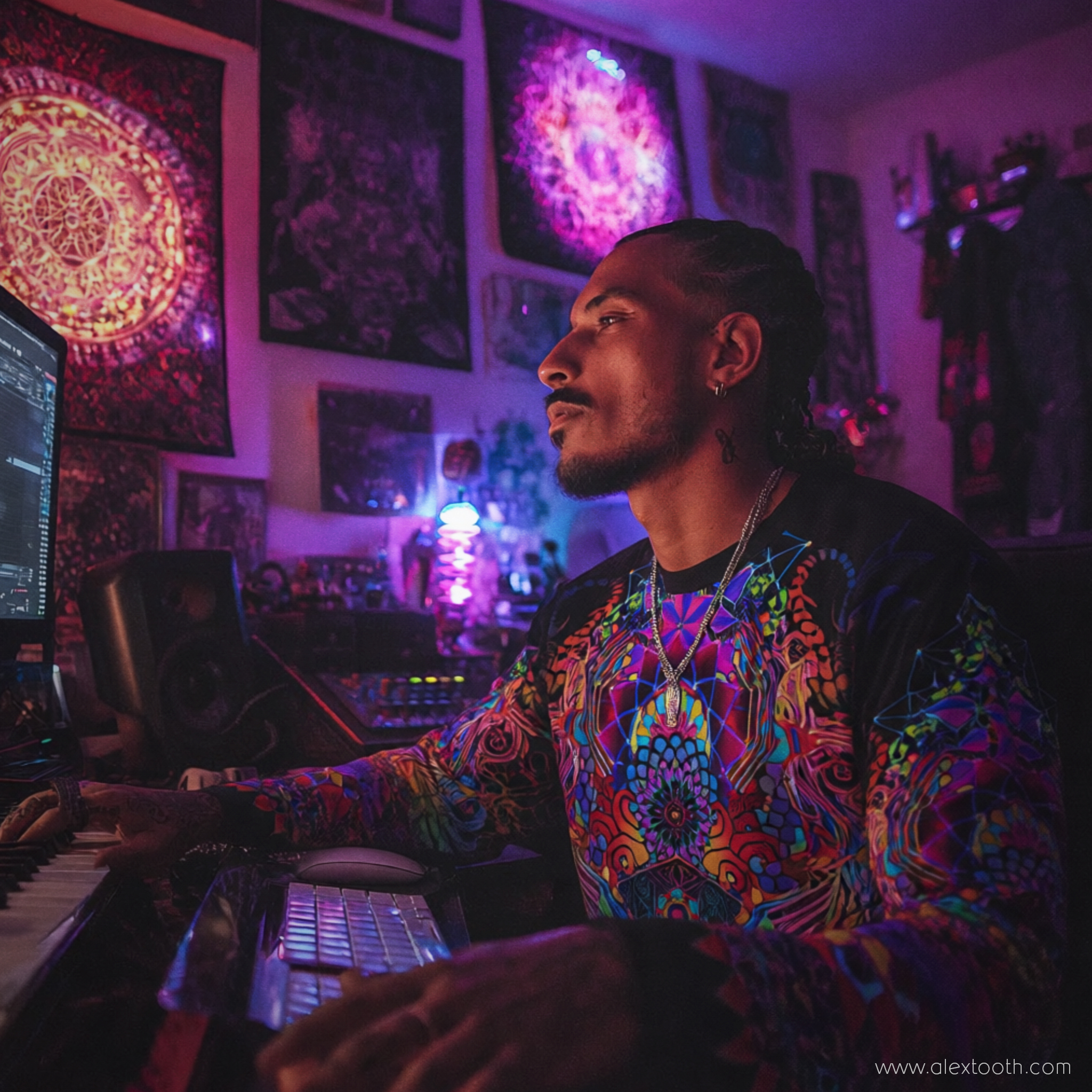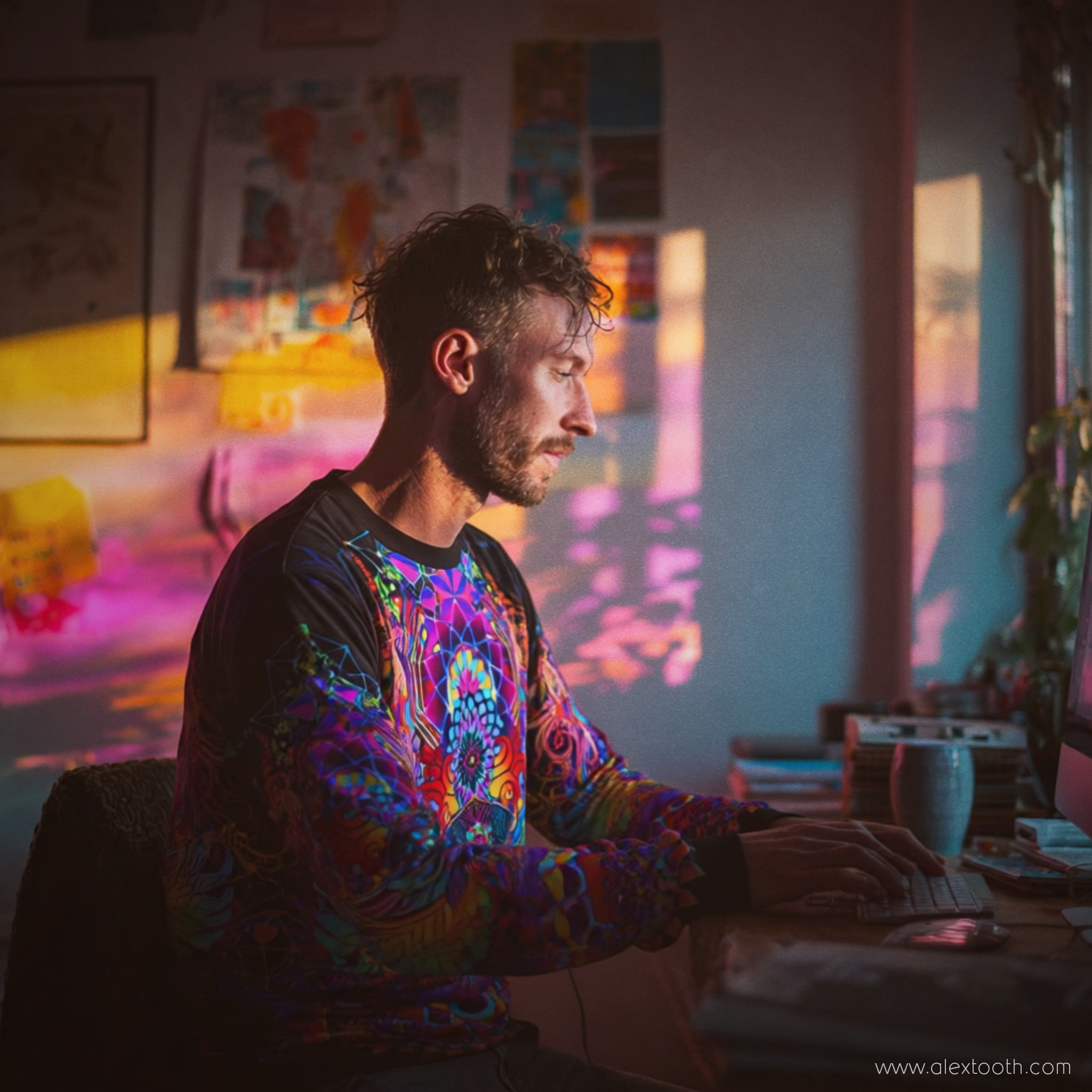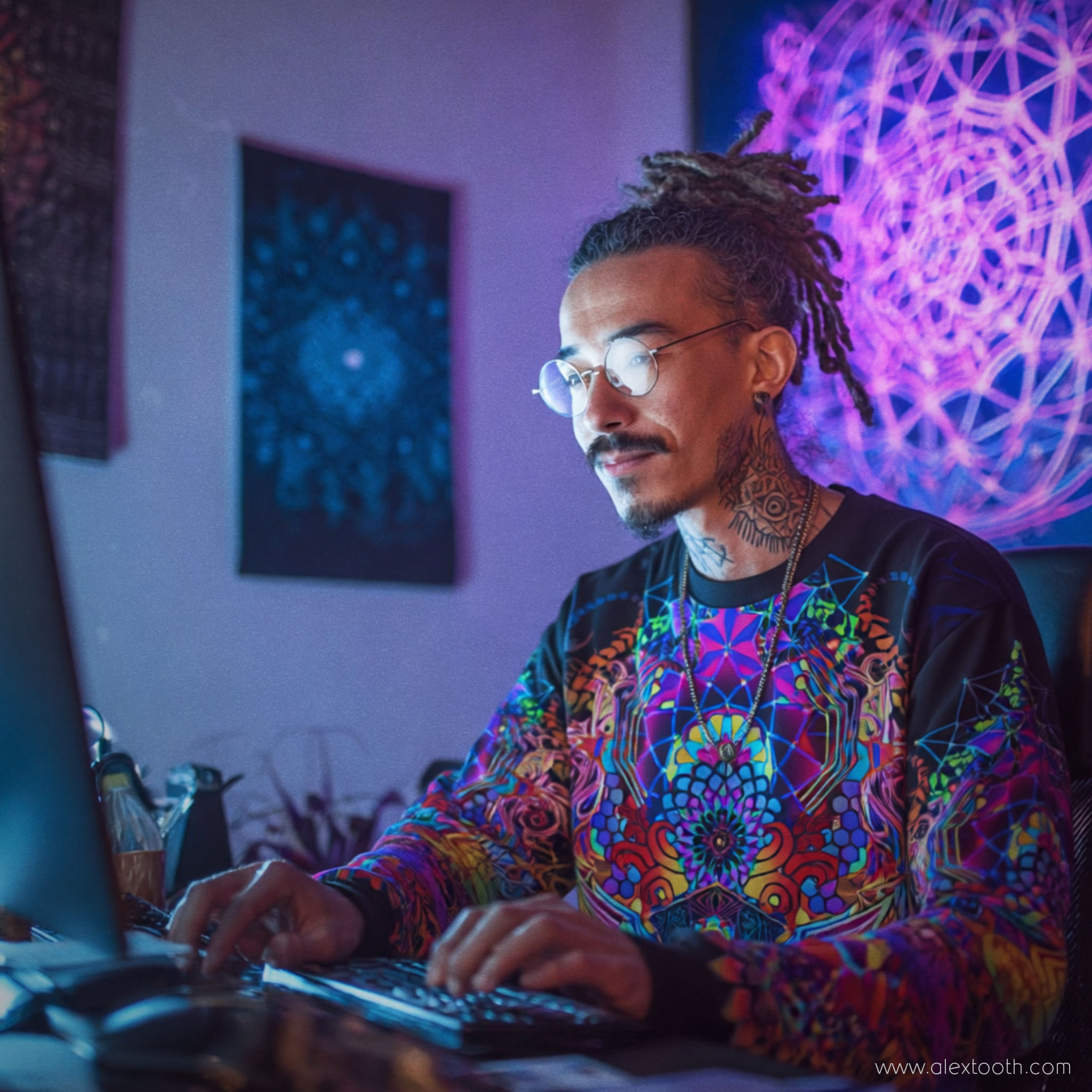 The Inner Flight artwork combines sacred geometry, winged symbolism, and vibrant fractal forms. It represents movement and expansion — not escape, but lift — a visual sense of alignment and momentum that carries through the entire garment.