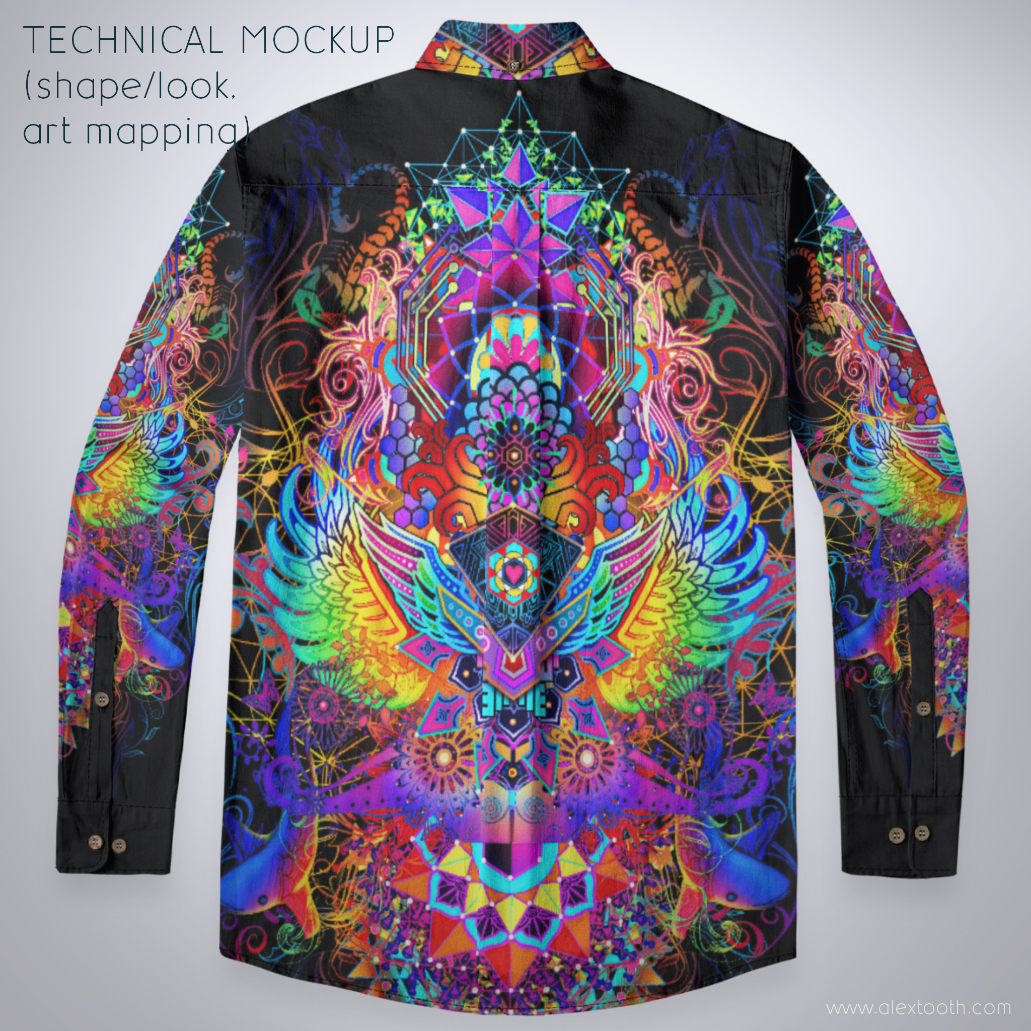 The Inner Flight artwork combines sacred geometry, winged symbolism, and vibrant fractal forms. It represents movement and expansion — not escape, but lift — a visual sense of alignment and momentum that carries through the entire garment.