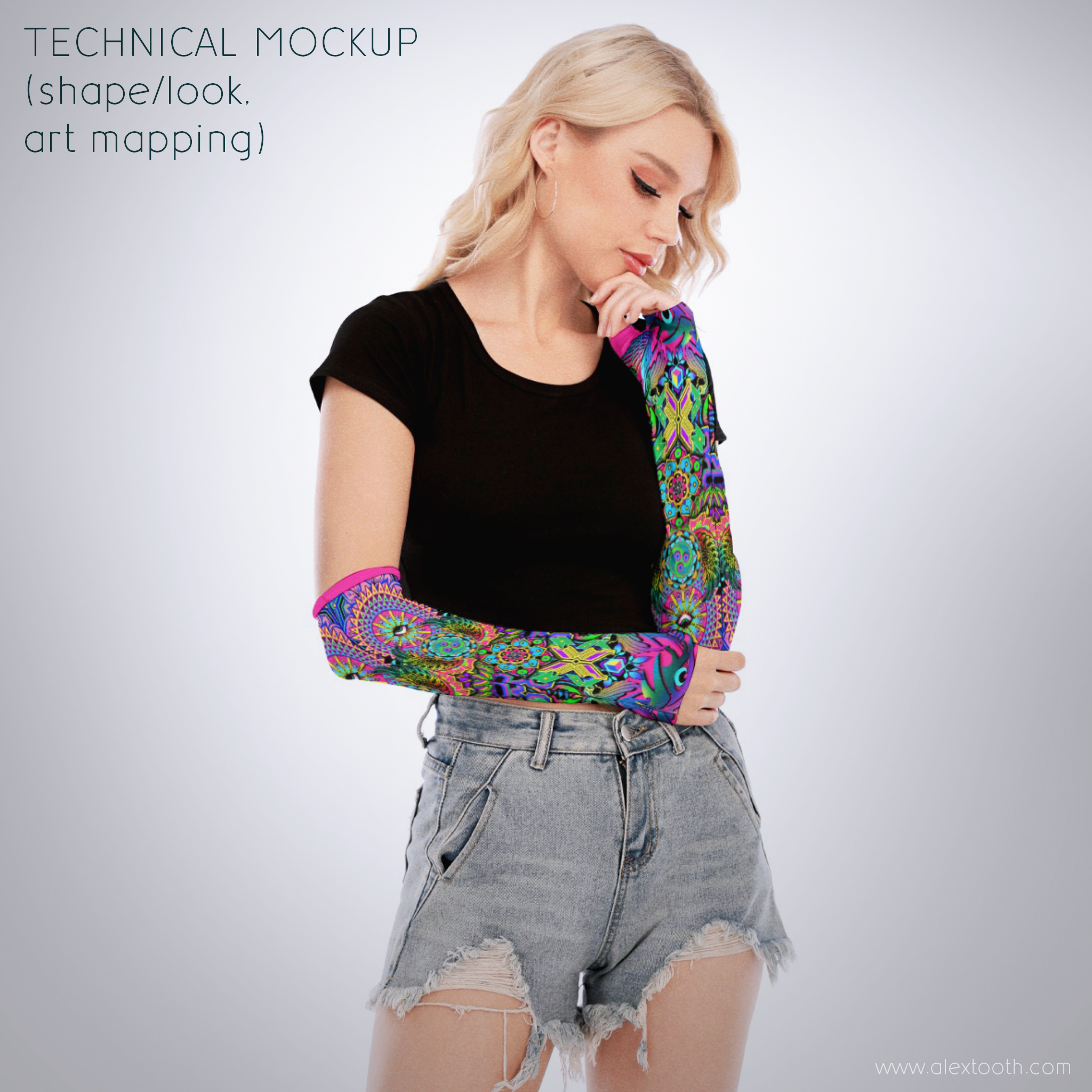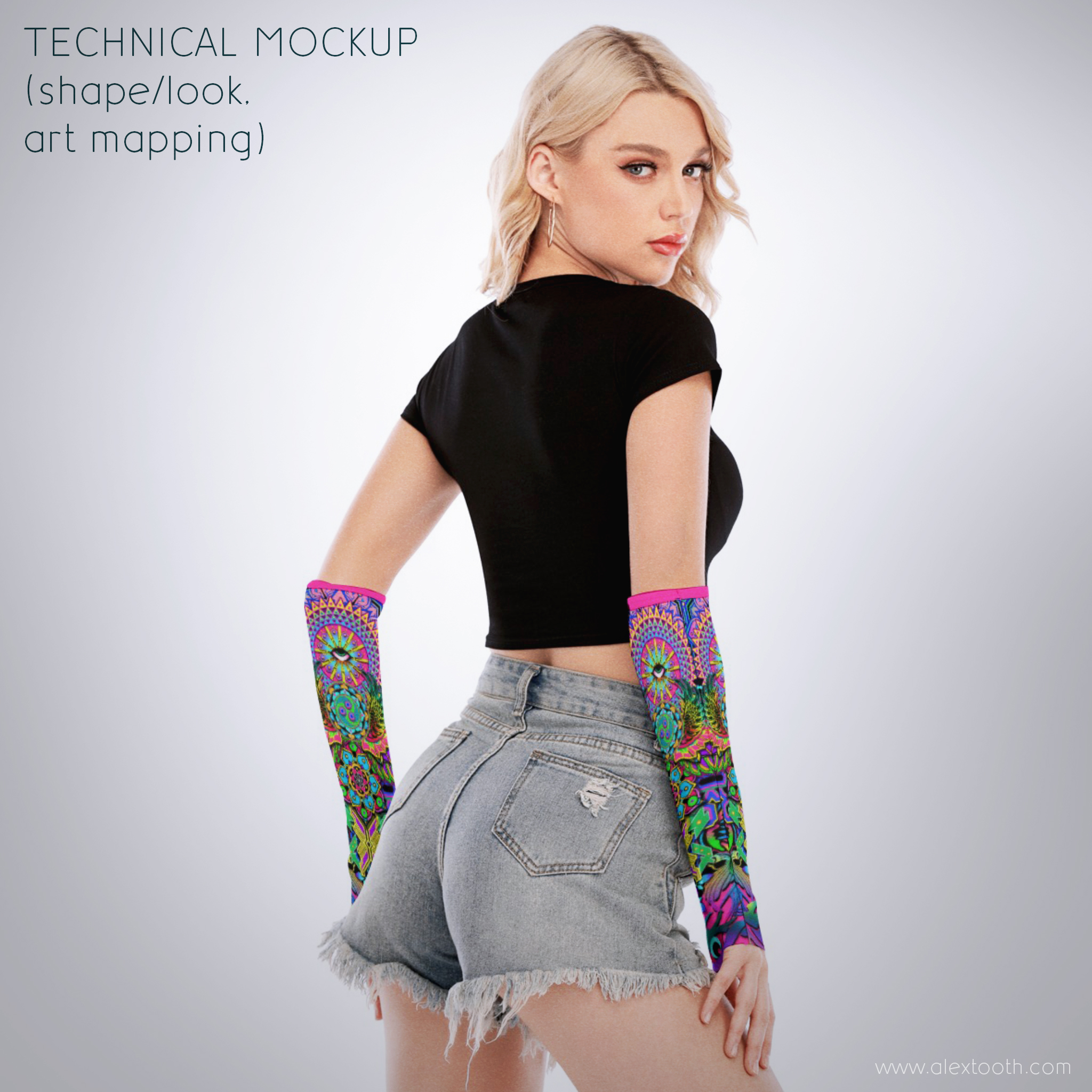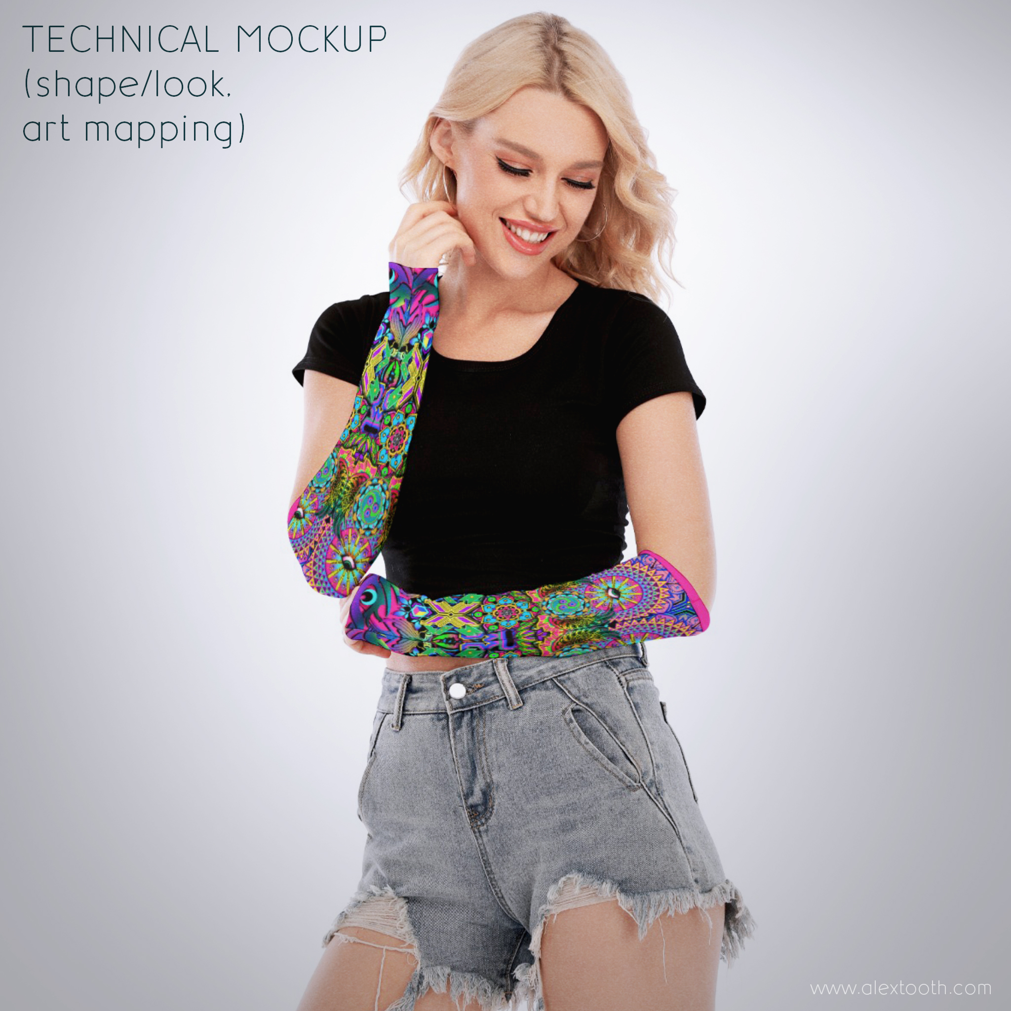 Cut long through the forearm with a fingerless glove design, AuraSleeves offer warmth, sun protection, and freedom of movement. They can be worn as arm warmers, gloves, or lightweight sleeves depending on context — functional enough for daily use, expressive enough for festivals, performance, and night spaces.