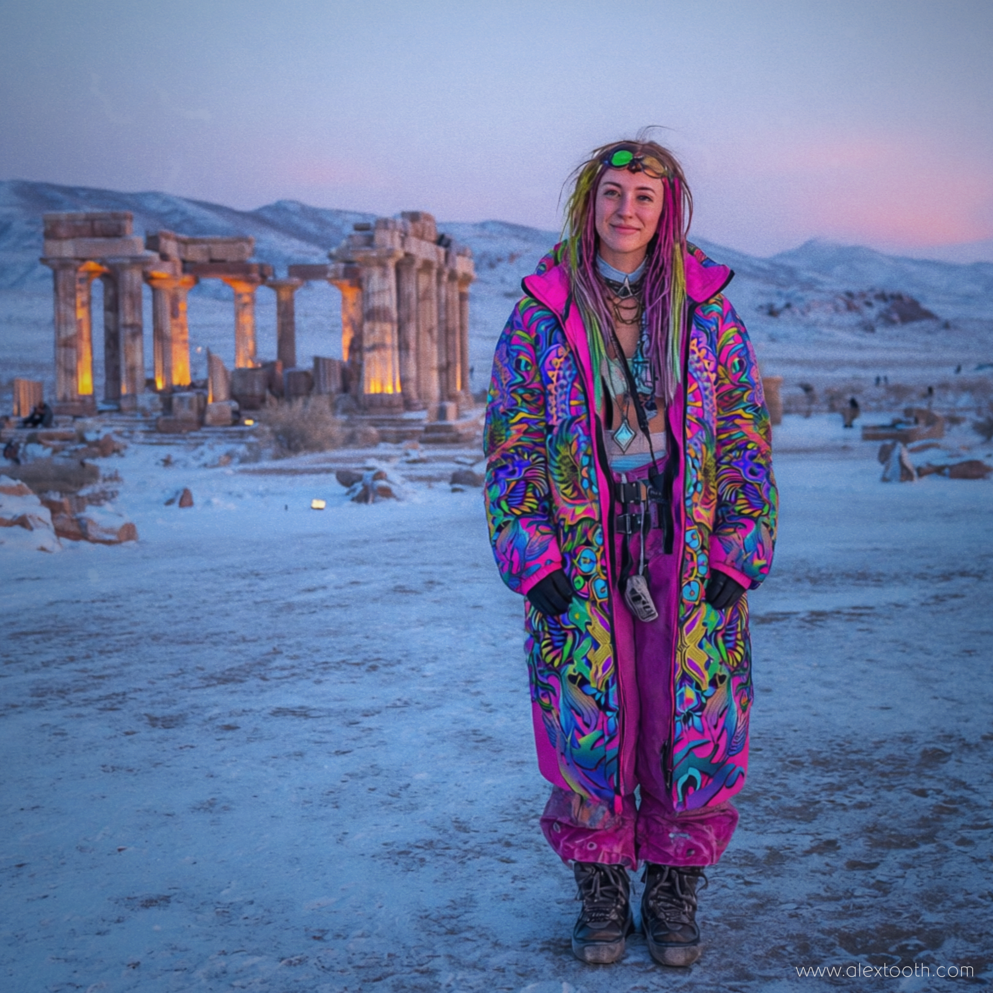 The Radiant Bloom Nomad Coat sits somewhere between protection and expression, shaped by the language of festival clothing, the energy of a rave outfit, and the grounded utility of a festival coat designed for real environments. It carries the visual rhythm of sacred geometry into something lived with, not just observed, holding that quiet balance between structure and flow.